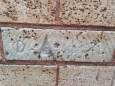 14. Initials carved into soapstone brick, SW corner of S. Locust St. and W. Main St.