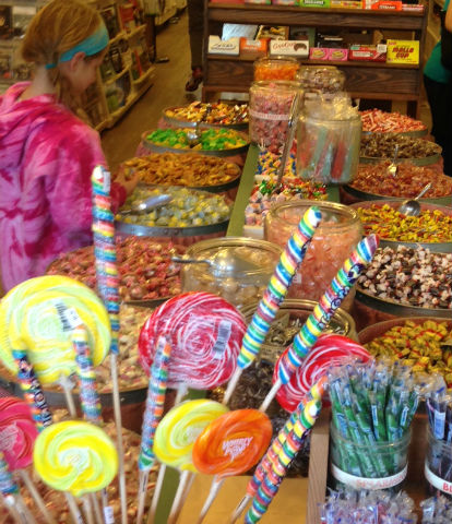 Past the barber shop to the Country Store, where a double-line of about thirty-five barrels and jars make a candicopia of hues, many of the brands already multicolored.