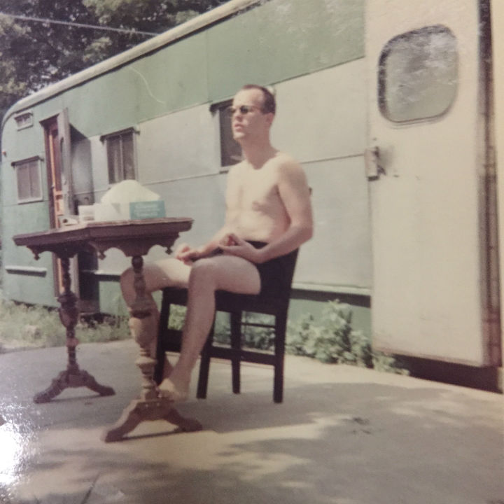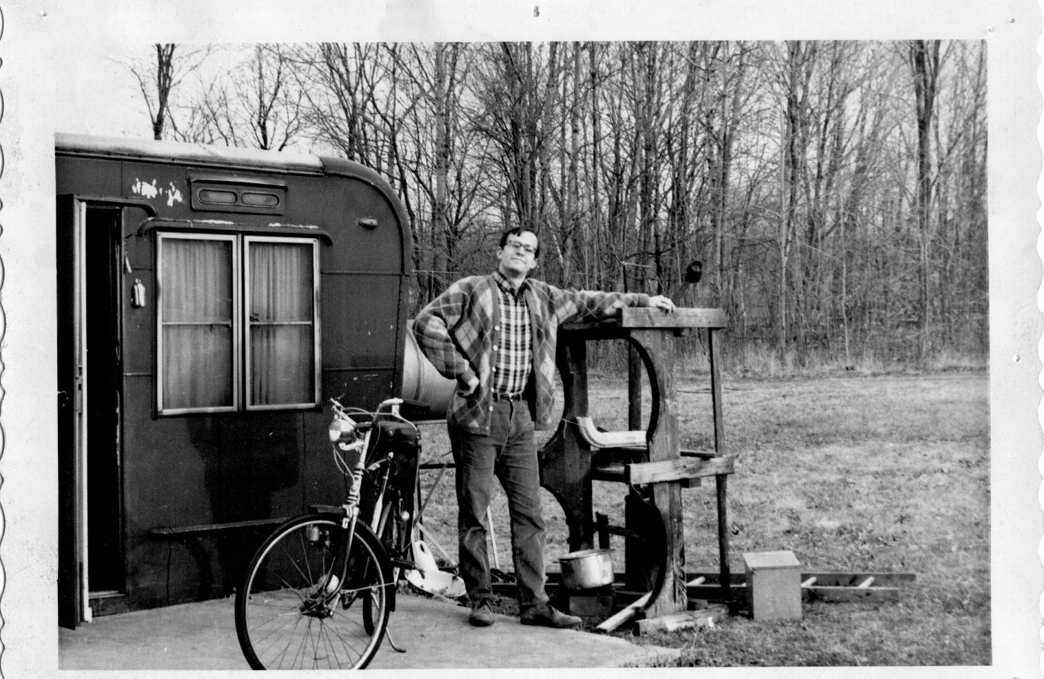 R. Wells by trailer with bike and marble machine (?). Christmas vacation 1965. Photo by Joy.